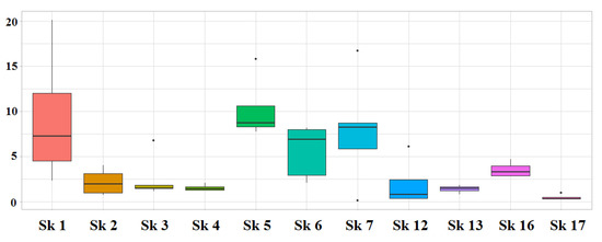 In total, a full prediction was achieved for three skeletons (sk_1, sk_3, and sk_5), whereas six skeletons showed a phenotypic prediction for both eye and hair color with different AUC losses because of incomplete genotyping data. For two skeletons (sk_6 and sk_17), no eye color prediction was achieved because of no availability (NA) of data for the rs12913832 marker [3,4,9].