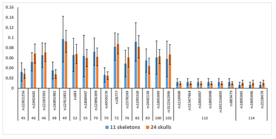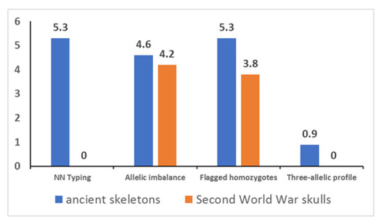 DNA degradation was a common feature of all samples. As expected, it was higher in the ancient skeletons, with 20/47 samples showing un-calculable Auto/Deg ratios, a result that highlights extreme levels of DNA degradation. The availability of sufficient amounts of template DNA (0.325 and 1 ng, respectively), however, allowed generation of libraries of good quality in 40/48 cases for the ancient skeletons and in 24/24 cases for the Second World War skulls, with 94.7% and 100% of the markers suitable for SNP typing. With regard to the eight libraries (16.7%) that yielded no typing, the reasons for this failure should be sought in nonspecific cloning of bacterial DNA sequences because PCR-CE technology yielded STR profiles of good quality from the same DNA extracts (see Figure A2). Similar nonspecific cloning was already reported for other PCR-MPS–based forensic kits used for typing bone remains [50,52]. Thus, the present finding highlights the need of further optimization strategies for library preparation from such samples. For example, purification or isolation of the amplicons before library building could be of help for preventing or limiting this issue [40,53].