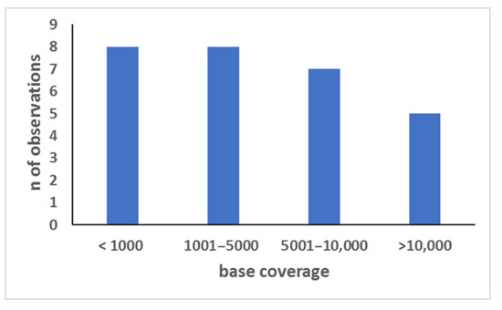 The availability of genetic typing data from more than one bone type was used to evaluate the repeatability of the results in 10 out of 11 ancient skeletons. The comparison of the PCR-MPS typing data made it possible to calculate the frequency of the allelic drop-out events, which was up to 5.6%. However, it is likely that the actual percentage of these PCR artifacts is higher because ambiguities could not be resolved for 8.3% of the markers. For example, the marker rs12821256 of ancient sk_6 was typed T/T in four bones, whereas the fifth bone yielded a T/C genotype. In this specific case, either the same allelic drop-out event occurred four times or a single allelic drop-in could be hypothesized (see below). Finally, it has to be emphasized that, in cases of allelic drop-out events, the coverage of the sister surviving allele could be very high. As shown in Figure 5, in fact, the coverage of these surviving alleles was less than 1000× in 28% of the cases, whereas it was even higher than 10,000× (up to 23,572×) in five cases. These results confirm that PCR is an error-prone method for studying aged genomes [1,25,26,45,49] and provide definitive evidence that there is no threshold for a locus call able to protect an expert from the misleading occurrence of allelic drop-out events.