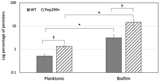 We previously showed that S. mutans produces higher numbers of persisters as the biofilm matures, probably due to the accumulation of CSP within the biofilm []. Therefore, we next sought to determine whether the overexpression of pep299 could produce even higher numbers of antibiotic persisters in a biofilm. Using crystal violet staining, we first confirmed that deletion of pep299 gene or its expression did not affect the biofilm biomass under the conditions tested (data not shown). We next performed a biofilm persister assay using static biofilms developed in a microtiter plate. As expected, the level of antibiotic persisters was statistically significantly greater (greater than five-fold) in the biofilm phase when compared to the free-floating planktonic phase for the WT strain (Figure 3). The Pep299+-overexpressing mutant produced even higher levels of antibiotic persisters (≥10-fold) in the biofilm vs. planktonic cultures. As shown in Figure 3, the levels of persisters in Pep299+ biofilms represent ~15% of the bacterial population. Altogether, these results suggested that pep299 functions as a persister-gene-promoting bacterial persistence factor of S. mutans during planktonic and biofilm growth.