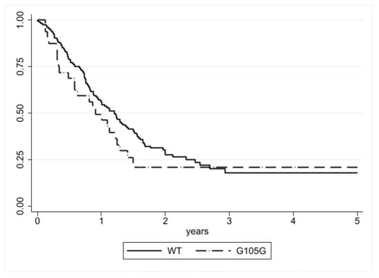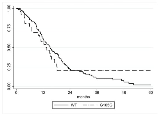 The prognostic significance of the G105G SNP was initially assessed in AML, demonstrating its independent association with worse prognosis in normal karyotype myeloid leukemias (AML-NK) [,,]. Few studies have explored the prognostic role of the G105G SNP in diffuse gliomas [,,], with conflicting data. Wang X et al. initially reported an unfavorable prognostic significance of the G105G SNP in malignant gliomas, while following studies did not observe this association. Conversely, Mistry AM et al. found no survival difference among patients with glioblastoma, according to the G105G SNP presence. These differences could be, at least, partially due to the evolving classification of CNS tumors during the last few years and the mixing of IDH-mutant and IDH-wildtype cases.