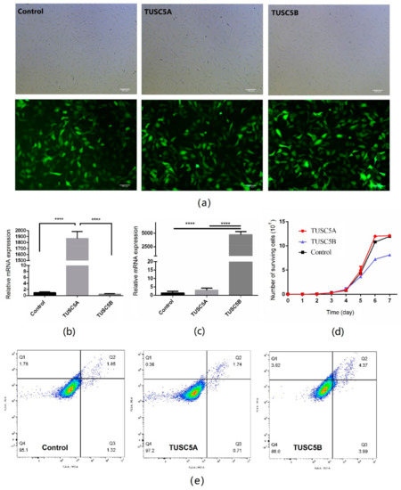 Over-expression cell models for different isoforms of TUSC5. (a) images for cell models of TUSC5A-C3H10, TUSC5B-C3H10, and control-C3H10. Green: cells that successfully transferred vectors by lentivirus and expressed cop-GFP protein; (b) relative TUSC5A mRNA expression level for cell models of TUSC5A-C3H10, TUSC5B-C3H10, and control-C3H10; (c) relative TUSC5B mRNA expression level for cell models of TUSC5A-C3H10, TUSC5B-C3H10, and control-C3H10; (d) growth-curves for cell models of TUSC5A-C3H10, TUSC5B-C3H10, and control-C3H10. Control: C3H10 cells were transferred with empty vector by lentivirus; TUSC5A: Control: C3H10 cells were transferred TUSC5A coding sequence by lentivirus; TUSC5B: Control: C3H10 cells were transferred TUSC5B coding sequence by lentivirus. Q1: shows necrotic cells, Q2: shows later period apoptotic cells, Q3: shows normal cells and Q4: shows early apoptotic cells. (e) cell statues after being plated for 48 h checked by flow cytometry. ****: p < 0.0001.
