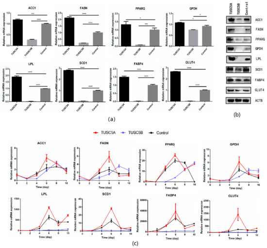 We checked the expression of eight important genes (PPARG, ACC1, FASN, SCD1, LPL, FABP4, GPDH, and GLUT4) of adipogenesis before and after cell differentiation using qPCR and Western blot. The result showed that all those eight genes were significantly up-regulated (student’s t-test, p < 0.05) in the TUSC5A-C3H10 cells while they were significantly suppressed in TUSC5B-C3H10 cells compared to that of control-C3H10 cells (Figure 3a,b). After being induced for adipogenesis, the eight genes exhibited different expression patterns but with a consistent result that all of them were promoted in TUSC5A-C3H10 cells and suppressed in TUSC5B-C3H10 cells after the 4th day (Figure 3c). The expression of PPARG, ACC1, FASN, and GPDH were put off for at least two days while the expression of FABP4, LPL, SCD1, and GLUT4 were suppressed throughout the 10 days in TUSC5B-C3H10 cells (Figure 3c).