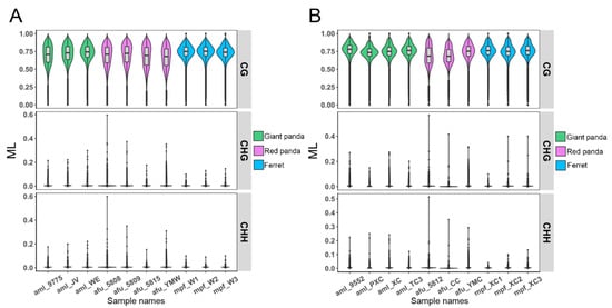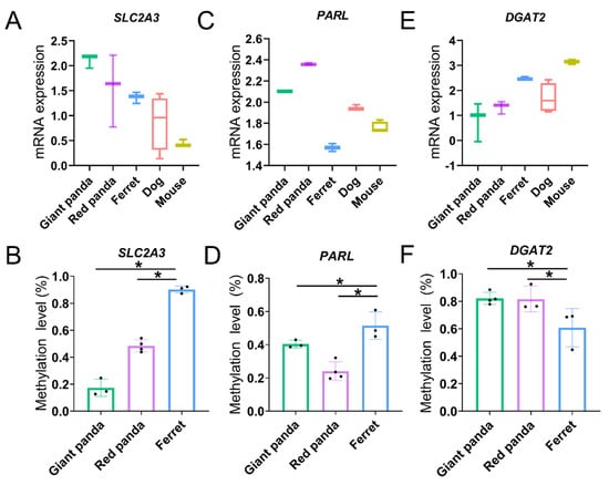 Li, L.; Shen, F.; Jie, X.; Zhang, L.; Yan, G.; Wu, H.; Huang, Y.; Hou, R.; Yue, B.; Zhang, X. Comparative Transcriptomics and Methylomics Reveal Adaptive Responses of Digestive and Metabolic Genes to Dietary Shift in Giant and Red Pandas. Genes 2022, 13, 1446. https://doi.org/10.3390/genes13081446