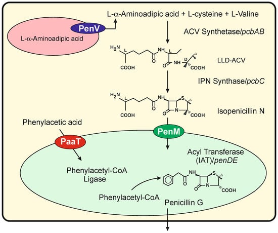 - Martín, J.F.; Ullán, R.V.; García-Estrada, C. Regulation and compartmentalization of β-lactam biosynthesis. Microb. Biotechnol. 2010, 3, 285–299. [Google Scholar] [CrossRef]