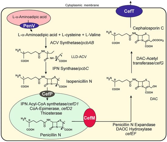 - Teijeira, F.; Ullán, R.V.; Guerra, S.M.; García-Estrada, C.; Vaca, I.; Martín, J.F. The transporter CefM involved in translocation of biosynthetic intermediates is essential for cephalosporin production. Biochem. J. 2009, 418, 113–124. [Google Scholar] [CrossRef]