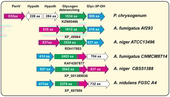 Gene organization of genome region encoding PenV and the glycogen debranching enzymes in different filamentous fungi, listed at the right of the figure. PenV-encoding genes are shown in pink color; genes for glycogen-debranching enzymes are shown in green; genes for glyceraldehyde-3P-dehydrogenase are shown in blue. Hypothetical or unrelated genes are in white. The accession numbers for the respective debranching enzyme are shown below the gene. The amino acid number is indicated inside the arrows. Note that in fused enzymes, the amino terminal moiety is labeled in green, and the carboxy-terminal region is in pink. In A. fumigatus CNMCM8714 and A. nidulans FGSC A4, the fused protein includes a complete PenV protein (800 and 832 aa, respectively), whereas in A. niger CBS52388, the fused protein contains only 504 aa of PenV; in addition, this fungi contains a separate adjacent penV gene.