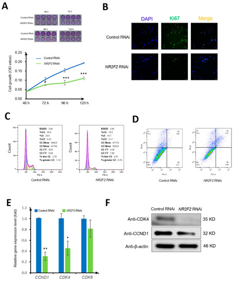 In order to further clarify how NR2F2 regulates cell cycle changes, we used qPCR to detect the changes of CCND1, CDK4, and CDK6 cell cycle-related genes. The results showed that the expression of CCND1 and CDK4 decreased after NR2F2 knockdown (p < 0.05). The Western Blot results also showed that the Cyclin protein expressions of D1 and CDK4 were decreased, which was consistent with mRNA expression (Figure 4E). NR2F2 may affect cell growth by regulating the expression of CCND1 and CKD4.
