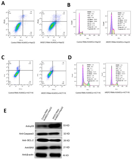NR2F2-depleted WJ-MSCs regulate the growth of HepG2 and HCT116 cells in different ways. (A) Apoptosis of HepG2 cells. (B) HepG2 cell cycle changes. (C) Apoptosis of HCT116 cells. (D) HCT116 cell cycle changes. (E) Western blot analysis of apoptosis-related protein expression.
