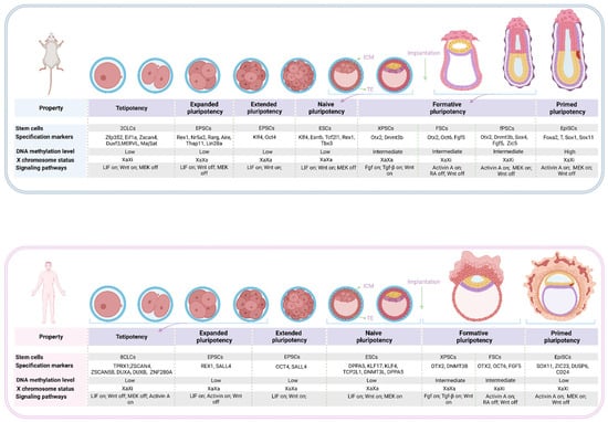 Second-class pluripotent stem cells derived from epiblasts show three states: naive, formative, and primed; although these cells are capable of differentiation into three germ layers, they exhibit many differences in cell morphology, signaling requirement, epigenetic modifications, metabolome, and transcription profiling [7,8].