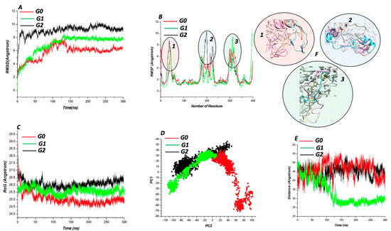 Backbone RMSDs depicted as a function of time for G0 (red), G1 (green), and G2 (black) (A). Cα fluctuation of G0 (red), G1 (green), and G2 (black) (B). RoG plot of G0 (red), G1 (green), and G2 (black) (C). PCA scatter plots depicting a distinct separation of motions between G0 (red), G1 (green), and G2 (black) (D). Intermolecular distance plot of G0 (red), G1 (green), and G2 (black) (E). The 3D structures of highly fluctuating region in the system (F).