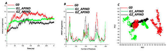 Backbone RMSDs are depicted as a function of time for the wildtype protein (G0) and bound variants (G1 and G2) (A). Cα fluctuation for the wildtype protein (G0) and bound variants (G1 and G2) (B). PCA scatter plots depicting a distinct separation of motions for the wildtype protein (G0) and bound variants (G1 and G2) (C).