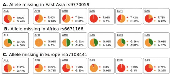 Examples of RACA SNPs for Africa, East Asia, and Europe. A pie chart of regional SNP allele frequencies taken from the Ensemble web site “Allele and genotype frequencies by population” (https://useast.ensembl.org/Homo_sapiens/Variation/ accessed on 20 May 2022) through SNP RS-identifiers. (A) Allele “G” is present globally, except for East Asia. (B) Allele “A” is present globally, except for Africa. (C) Allele “G” is present globally, except for Europe. One explanation for this phenomenon is fixation of common alleles in particular regions/continents. Distribution of RACA SNPs is shown in Table 2.