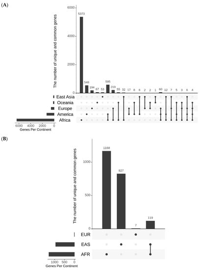 UpSet diagrams showing the number and nature intersections of gene lists for ARSA (A) and RACA (B). Vertical bars show the number of genes resulting from the intersections between gene lists. Horizontal bars depict the total number of genes in each continental group. The nature of intersections is shown with gray and black dots. A black dot means the presence of the gene in the corresponding continental group, while a gray dot means the absence of the gene in corresponding group. Black dots connected by lines indicate the continental groups involved in the interaction. For example, one black dot and four gray ones correspond to the vertical bar that shows the number of genes present in one continental group and absent in all other groups.