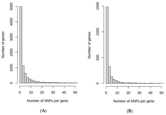 Distribution of the number of ARSA (A) and RACA (B) SNPs per gene.