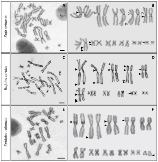 C-banded metaphase chromosomes from B. spinosus (A), B. viridis (C) and E. calamita (E). For each species, a C-banded metaphase (A,C,E) and the corresponding karyotype (B,D,F) are included. C-positive bands already described in other populations are indicated by black arrow heads, while those non-described previously are depicted by black arrows. White arrow heads depict previously described C-positive bands not identified in our samples. C-bands in B. spinosus were compared with those published for B. bufo [17,20,21,34]. C-bands in B. viridis were compared with data from [17,20,22,35], while C- banding information in E. calamita was obtained from [20]. Scale bar: 2.5 μm.