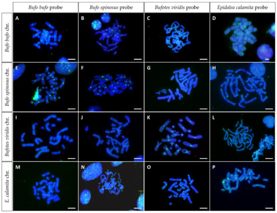 In situ hybridization using genomic DNA (GISH) from B. bufo (A,E,I,M), B. spinosus (B,F,J,N), B. viridis (C,G,K,O) and E. calamita (D,H,L,P) as probe, on metaphase chromosomes from B. bufo (A–D), B. spinosus (E–H), B. viridis (I–L) and E. calamita (M–P). The probes were labeled with biotin 11–dUTP and results were obtained after three rounds of immunological amplification using an avidin-FITC/biotinylated anti-avidin system. Scale bar: 5 μm.