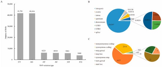 After completing the sequencing, SNP site variant identification on the tested germplasm was carried out using the Genome Analysis Toolkit (GATK; https://gatk.broadinstitute.org/hc/en-us, accessed on 15 June 2019) process and samtools. The identified SNPs were filtered, and 105,325 high-quality SNPs were obtained for subsequent analyses. An analysis of the types of predicted mutations associated with these SNPs showed that of the 6 possible single-base mutations, C/T and A/G transitions were the most frequent, accounting for 39.59% and 39.51% of the total, respectively. Of the 105,325 SNPs, 83,317 were transitions and 22,008 were transversions (Figure 1A). Further analysis of the SNP distribution in the genome found that 83.96% were located in intergenic regions, 4.16% were located in introns, 1.30% were located in exons, 5.49% were located in the 5-kb region upstream of the transcriptional start site, 4.82% were located in the 5-kb region downstream of the transcription termination site, 0.06% and 0.12% were located in the 5′ and 3′ UTRs, respectively, and 0.06% were located in the splice junctions (Figure 1B). Functional annotation of the SNPs in the exonic regions of the genes is shown graphically in Figure 1C. There were 4427 non-synonymous single-nucleotide variants (SNVs) that are predicted to cause changes in the encoded amino acid, and 2514 synonymous SNVs that are predicted not to change the amino acid sequence. The ratio of non-synonymous SNVs to synonymous SNVs is 1.76. In addition, 182 SNPs are predicted to produce a premature stop codon (stop gain) and 103 SNPs were predicted to abolish a stop codon (stop loss).