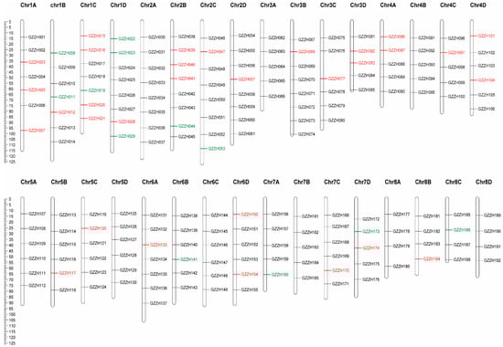 Distribution of SNP markers on sugarcane chromosomes. Red represents the core SNP markers, green represents the candidate SNP markers.