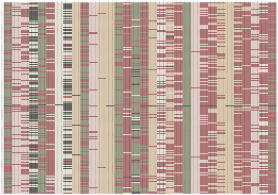 Fingerprints of 180 sugarcane accessions Each line represents one SNP locus and each column represents one accession. Green (BCCBB0), apricot (D7CAB1), caesious (9C9EB9), light pink (DCCFCB), and plain grey (525B66) represent A/A, T/T, G/G, C/C, and N/N, respectively. Heterozygous genotypes are shown in claret-red (A77979).