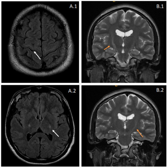 Brain MRI from the proband. Images (A.1,A.2) correspond to fluid-attenuated inversion recovery (FLAIR) sequences, showing hyperintensity affecting the pyramidal tracts bilaterally (white arrows). These features suggest degeneration of the corticospinal pathway and can also be observed in coronal T2-weighted images (B.1,B.2) as increased signal intensities at the internal capsule. The latter radiologic appearance is also known as the “Wine Glass” sign.