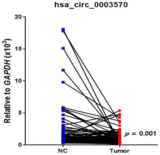 Dot plot of hsa_circ_0003570 expression in noncancerous (NC) tissue and cancer tissue in hepatocellular carcinoma. A paired t-test showed that hsa_circ_0003570 expression decreased in tumor tissue compared to that in the NC tissue (p = 0.001).