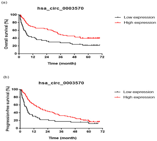 Survival curves according to the hsa_circ_0003570 expression level. Overall survival (a) (log-rank test, p = 0.002) and progression-free survival (b) (log-rank test, p = 0.007) rates were decreased in the low hsa_circ_0003570 expression level group.