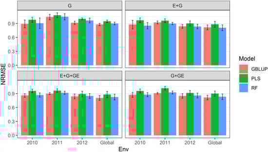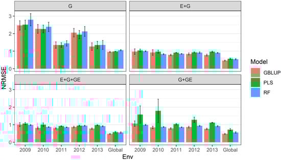Prediction performance for each environment and across environments (Global) of dataset 1 (Indica) in terms of normalized mean square error (NRMSE) under four predictors (G, genotypic information; E + G. environment plus genotypic information; E + G + GE, environment plus genotypic plus genotype by environment interaction information; and G + GE, genotypic plus genotype by environment interaction) and under the sevenfold cross-validation (CV) scheme.