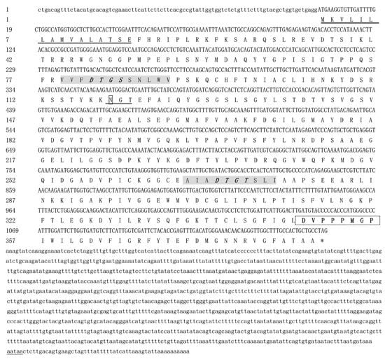 Full cDNA sequence and predicted amino acid sequence of Mn-CTSD. Signal peptides are represented by a solid underline; The N-glycosylation sites were in the square box of thick line. The two aspartic protease signature sequences were marked with gray shadows. The catalytic motifs (-DTGS-, -DTGT-) were in bold italics, and the enzyme activation sites were in bold and single underline. Non-digestive Mn-CTSD signature sequences are shown in bold with dotted boxes. Wavy line labeling is a tail signal.