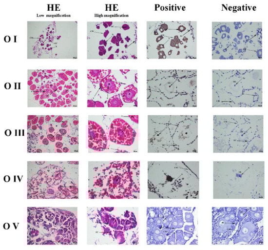O-I (undeveloped stage, transparent), O-II (developing stage, yellow), O-III (nearly-ripe stage, light green), O-IV (ripe stage, dark green), O-V (worn out stage, gray). OC: oocyte; N: nucleus; CM: cytoplasmic membrane; Y: yolk granule; FC: follicle cell; FM: follicle membrane; Scale bars: Low magnification 100×, High magnification 400×. HE represents the blank control groups with routine hematoxylin-eosin staining. Negative represents the control groups with antisense probes poured. Positive represents the experimental group with sense probes poured.