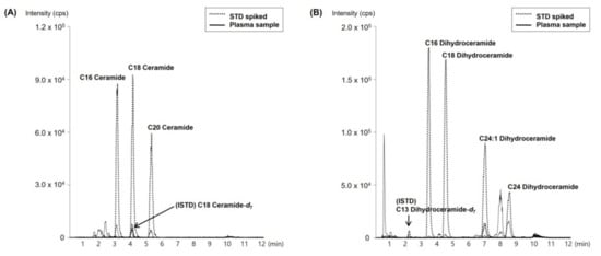 MRM chromatograms of (A) Cer-16, Cer-18, and Cer-20, and (B) DhCer-16, DhCer-18, DhCer-24, and DhCer-24:1 spiked at 50 ng/mL in 4% BSA with control human plasma. The STD and ISTD indicate the standard and internal standard, respectively. Cer-18-d7 and DhCer-13-d7 were used as ISTDs.