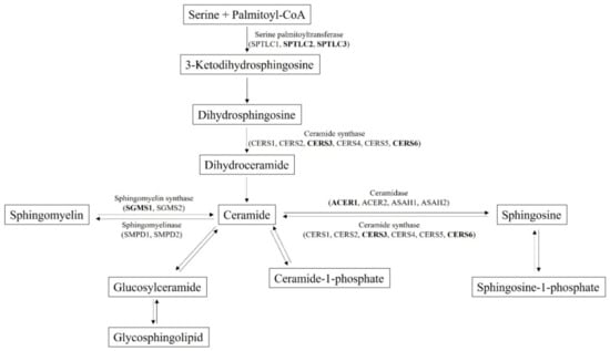 The six significantly elevated plasma ceramide levels in subjects with MetS were considered for association analysis with selected SNPs (p < 5.0 × 10−2) genotyped using the KoreanChip. From SNPs that passed the threshold of p < 5.0 × 10−2 in the MetS group compared to that of the control group, we narrowed down the number of candidate SNPs by gene function annotation. Genes known to be associated with the ceramide synthesis pathway (Figure 2) were regarded as target genes and SNPs from these genes were selected.