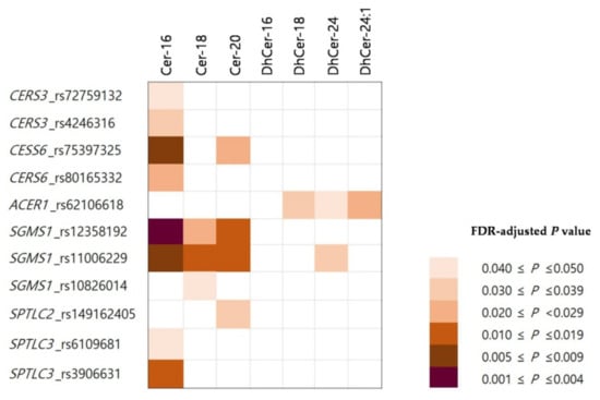 Selected SNPs were analyzed for association with plasma dihydroceramide and ceramide levels using linear regression models. Then, the results were adjusted to elucidate false positives resulting from multiple testing by Benjamini–Hochberg FDR-adjusted p value calculation and associations were considered statistically significant at FDR-adjusted p values of <5.0 × 10−2. Association analyses were undertaken for each dihydroceramide and ceramide using the R package software (Ver. 3.5.3).