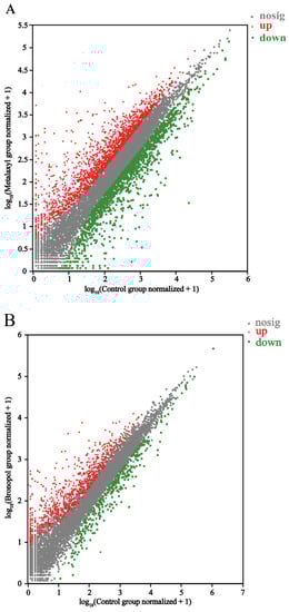 Genes of S. parasitica following three antimicrobials’ action were screened (analyses of the screening data). Three groups of data were compared: control vs. metalaxyl, control vs. bronopol and control vs. copper sulfate groups. In total, 8508 DEGs were identified upon pairwise comparisons: 3187 DEGs (1771 up- and 1416 downregulated) in the control vs. metalaxyl group, 1042 DEGs (723 up- and 319 downregulated) in the control vs. bronopol group and 4279 DEGs (2118 up- and 2161 downregulated) in the control vs. copper sulfate group (Figure 2). Unsupervised cluster analyses were performed based on DEGs using a Euclidean distance formula. In comparison to the control group, the gene expressions of S. parasitica were significantly affected by the antimicrobials. There were also significant differences among the metalaxyl, bronopol and copper sulfate groups, which indicated that the three antimicrobials had different effects on S. parasitica (Figure 3).