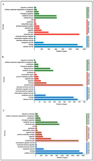 DEGs of control vs. metalaxyl group (A), control vs. bronopol group (B) and control vs. copper sulfate group (C) were assigned to GO categories, and the terms are categorized into three main GO categories. The top 20 enriched GO terms are presented in the figure.