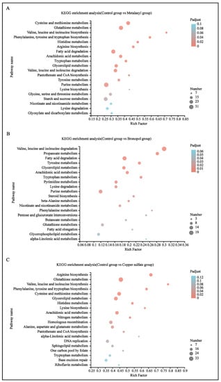 DEGs of control vs. metalaxyl (A), control vs. bronopol (B) and control vs. copper sulfate groups (C) were assigned to KEGG pathway annotations. The top 20 enriched KEGG pathways are presented in the figure.