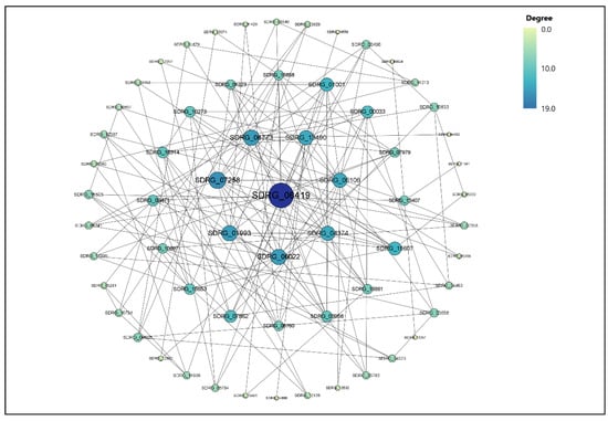 Based on the results of transcriptome sequencing, 314 DEGs from control vs. metalaxyl, control vs. bronopol and control vs. copper sulfate groups were screened for protein–protein interaction network analysis. The 314 DEGs were present in control vs. metalaxyl, control vs. bronopol and control vs. copper sulfate groups and were significantly different (p < 0.05). The main protein interaction cluster derived from the 314 DEGs contained 63 nodes, each representing 1 protein and connected by 100 edges (Figure 6). SDRG_06419 (SPRG_08456), followed by SDRG_07258 (SPRG_03679), SDRG_01993 (SPRG_04185), SDRG_06022 (SPRG_10775) and SDRG_06773 (SPRG_05141) presented the highest scores for degree centrality (DC), indicating that they were the most important factors for the network.
