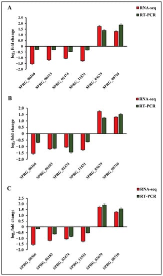 To validate the expression data of RNA-seq, we selected six DEGs for qRT-PCR analysis, including two upregulated (SPRG_03679, SPRG_08710) and four downregulated (SPRG_00366, SPRG_06183, SPRG_02474, SPRG_11531) genes (Figure 7; Supplementary Table S1). To compare the expression data between RNA-seq and qRT-PCR, the relative expression level was transformed to log2 fold change. The results verify that six of the genes examined are consistent with the results of RNA-Seq, indicating the reliability of the RNA-seq expression profile in this study.