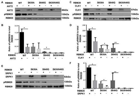 Kinases belonging to the AKT, CLK, and SRPK kinase families have previously been shown to phosphorylate the RS domain in splicing factors [31,32,33]. To test whether kinases belonging to these families can also phosphorylate the RSRSP stretch in the RS domain of RBM20, plasmids carrying AKT2, CLK1, and SRPK1 were co-transfected with either WT or mutant RBM20 constructs in HeLa cells. HeLa cells were chosen because these cells do not express RBM20, thus allowing for the avoidance of confounding signals from endogenous protein. Co-transfection of WT or mutant RBM20 with empty plasmid (no kinase) was used as a control. Cells were harvested, and lysates were prepared 48 h post-co-transfection. Proteins from each treatment were subjected to Western blot analysis, using anti-phospho-RBM20 (gift from Dr. Hidehito Kuroyanagi) [40], which recognizes phosphorylation of the RSRSP stretch located in the RS domain of RBM20, and anti-pan-RBM20 (home-made) antibodies [2]. The Western blot analysis confirmed the increased expression of AKT2, CLK1, and SRPK1 in HeLa cells transfected with these kinases relative to cells transfected with empty plasmid (Figure 1A,C,E). Phosphorylation of the RSRSP stretch in WT RBM20 was significantly increased by co-transfection with all three kinases when compared to that in cells co-transfected with empty plasmid (Figure 1). Furthermore, co-transfection with each of the three kinases increased phosphorylation of the mutated RSRSP stretch in S638A and S640G RBM20, with the exception that phosphorylation of S638A RBM20 did not increase significantly in response to co-transfection with AKT2 (Figure 1). As expected, phosphorylation of the double mutant (S638A/S640G), which lacks the two phosphorylatable Ser residues in the RSRSP stretch, was not detected (Figure 1). Collectively, these data demonstrate that co-transfection with AKT2, CLK1, or SRPK1 increases the phosphorylation of the RSRSP stretch in RBM20-transfected HeLa cells.