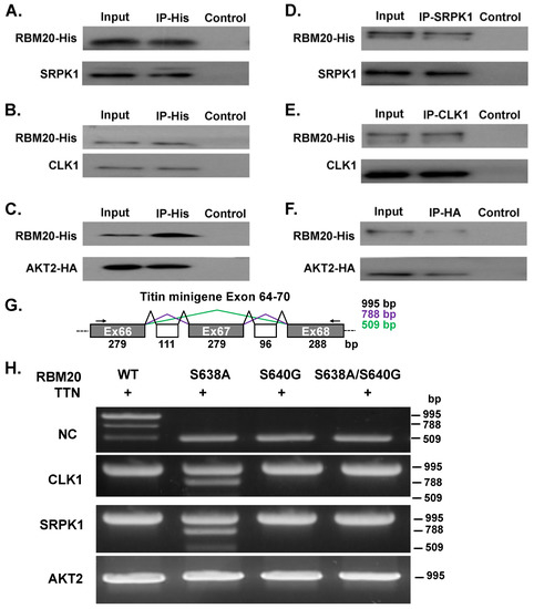 Next, we sought to determine whether RBM20 interacts with AKT2, CLK1, and SRPK1 in co-transfected HeLa cells, using co-immunoprecipitation (co-IP). Plasmid containing RBM20 with an 8xHis-tag was co-transfected with individual kinase constructs in HeLa cells. Cells were harvested 48 h after co-transfection, and protein lysates were prepared and subjected to co-IP. An anti-His-tag antibody was used to capture RBM20 protein complexes, which were subsequently analyzed by Western blot, using anti-RBM20, anti-SRPK1, anti-CLK1, and anti-HA-tag antibodies. The Western blot analysis revealed that SRPK1 (Figure 3A), CLK1 (Figure 3B), and AKT2 (Figure 3C) immunoprecipitated with RBM20. In the reciprocal experiments, SRPK1, CLK1, and HA-tagged AKT2 were used as bait to capture RBM20. Consistently, the IP of all three kinases also pulled down RBM20 (Figure 3D–F). Notably, controls lacking antibody conjugated to the beads failed to capture any of the target proteins (Figure 3A–F).
