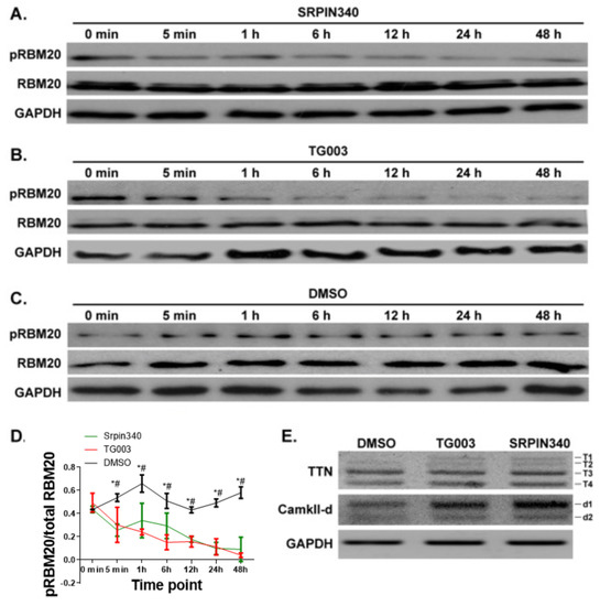 Next, we tested whether the inhibition of endogenous SRPK and CLK family kinases impacts RBM20 RSRSP phosphorylation in isolated NRCMs. NRCMs were isolated from 1-day-old rats and treated with either SRPIN340 or TG003—selective inhibitors of SRPK and CLK kinases, respectively. NRCMs were harvested at different time points (0 min, 5 min, 1 h, 6 h, 12 h, 24 h, or 48 h) following inhibitor treatment, and RBM20 phosphorylation was assessed by Western blot. In agreement with the results of our previous experiments, we detected a time-dependent decrease in the phosphorylation of the RSRSP stretch in RBM20 beginning 5 min after the initiation of inhibitor treatment (Figure 4A,B,D). Conversely, phosphorylation of the RBM20 RSRSP stretch was not decreased following vehicle (DMSO) treatment (Figure 4C,D). Ttn and Camk2d are well-established targets of RBM20 [3]. Inhibition of kinases SRPK1 and CLK1 increased the expression of larger variants of both Ttn (t-1) and Camk2d (d-1) when compared to the control DMSO treatment (Figure 4E). Collectively, these results are in accordance with those of our previous experiments and verify that CLK and SRPK family kinases regulate phosphorylation of the RSRSP stretch within the RS domain of RBM20 and target splicing in vivo.