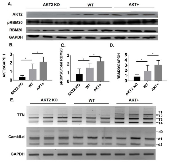 RBM20 phosphorylation and target splicing alterations in Akt2 KO and overexpressing mice. (A) Western blot analysis of RBM20 phosphorylation, RBM20 expression, and AKT2 expression in Akt2 KO and overexpressing mice. WT mice were used as control. (B) Quantification of AKT2 expression. (C) Quantification of RBM20 phosphorylation. (D) Quantification of RBM20 expression. (E) Detection of alterations in the splicing of Ttn and Camk2d pre-mRNAs, using RT-PCR, in the hearts of Akt2 KO and overexpressing mice relative to WT. KO, knockout; WT, wild type; AKT+, AKT overexpression. T1–T4, Ttn splice variants; d1–d4, Camk2d splice variants; GAPDH served as a loading control for Western blot and housekeeping gene for normalization of RT-PCR data. Data are presented as mean ± SD (n = 3); * p < 0.05.