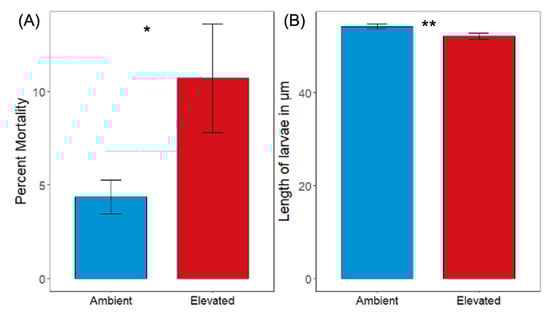 (A) Percent mortality for 7 day old oyster larvae before transplantation into the alternative pCO2 treatment (* denotes significant difference for (A), G-test of independence, p < 0.001; n = 4, with a minimum of 100 larvae per replicate). Error bars are the 95% confidence intervals. (B) Length in micrometers for 7 day old oyster larvae before transplantation into the alternative pCO2 treatment in the reciprocal transplant experiment (** denotes significant difference for (B), Mann–Whitney U test, p < 0.001; n = 4, with a minimum of 65 larvae per replicate). Error bars denote standard error of the mean.