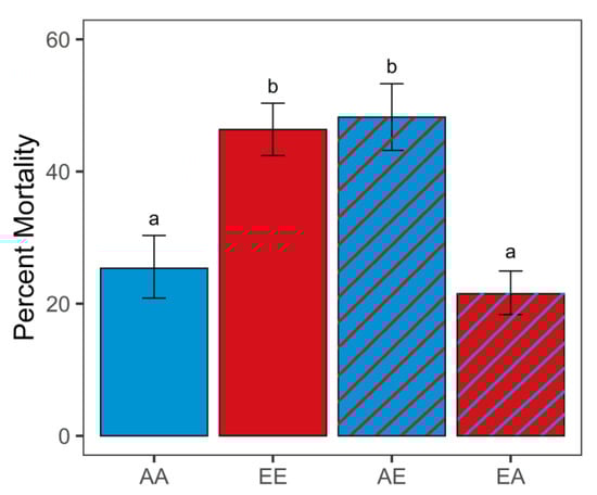 Percent mortality 1 week post-transplant (different letters a, b above error bars represent significant difference, G-test of independence, p < 0.001; n = 4 per treatment, with a minimum of 340 larvae per replicate). Error bars are the 95% confidence intervals. Sample code names: first letter indicates original pCO2 treatment (A: ambient, E: elevated); second letter indicates final pCO2 treatment (first and second letters are different for transplanted treatments).