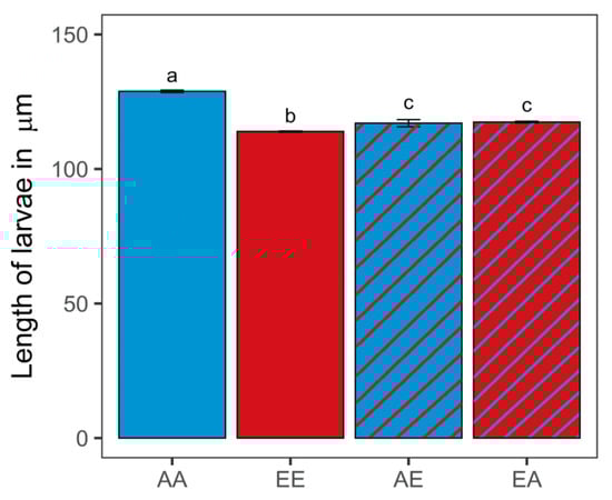 Length in micrometers for 15 day old oyster larvae transplanted (diagonal lines) and kept as controls (solid) (different letters a, b, c above error bars denote significant difference, Kruskal–Wallis rank sum test, p = 0.013; n = 4, with a minimum of 180 individuals per replicate). Error bars denote standard error of the mean. Sample code names: first letter indicates original pCO2 treatment (A: ambient, E: elevated); second letter indicates final pCO2 treatment (first and second letters are different for transplanted treatments).