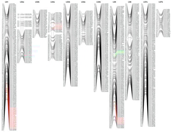 Linkage map of PR-25 population, including 11 linkage groups. A total of 139 unique loci were mapped on chromosome 2 linkage group 1 (Chr2LG1), 48 on Chr6LG2a, 31 on Chr6LG2b, 51 on Chr5LG3a, 91 on Chr5LG3b, 38 on Chr4LG4a, 97 on Chr4LG4b, 134 on Chr3LG5, 106 on Chr1LG6, 135 on Chr7LG7a, and 31 on Chr7LG7b. The total number of unique loci was 901 and the total distance of this linkage map was 855.35 cM. Three QTLs were found related to protein concentration and were located on chromosomes 2, 3 and 5 and one QTL was identified for yield which was located on chromosome 5. These protein-related QTLs (PC-QTL-1, PC-QTL-2 and PC-QTL-3) accounted for 22%, 11% and 17% of the phenotypic variation for protein concentration in PR-25, respectively. The identified QTL for yield, indicated in green, explained 11% of the phenotypic variation for yield.