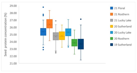 Boxplot of mean seed protein concentration of the PR-25 population (108 RILs) in 7 station-years from 2019 to 2021.
