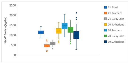The boxplots show the mean and the range of protein concentration in PR-25 in each station-year (Figure 2). Generally, the average protein concentration of PR-25 was higher in 2021 than in 2020. The variation in average protein concentration can be attributed to the differences in temperature and precipitation in each year. A higher summer temperature and lower precipitation were recorded in 2021 than in 2020, which resulted in a lower seed yield, but a greater protein concentration (Table 1). The boxplot of yield*protein showed that the total protein production in 2021, despite having the greater protein concentration, was significantly lower compared to 2019 and 2020 (Figure 3). ANOVA showed that both the genotype and station-year had significant effects on protein concentration (Table 2).