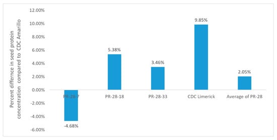 Percent difference in seed protein concentration of CDC Limerick introgression lines containing identified QTLs associated with protein concentration, and the average of all PR-28 introgression lines, compared to CDC Amarillo.