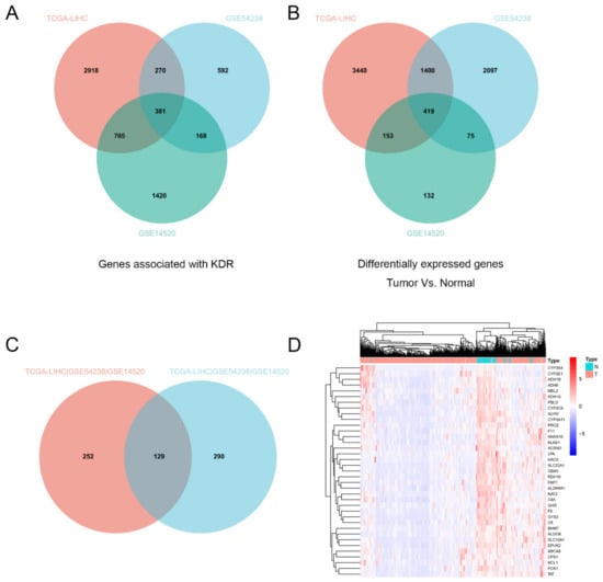 (A) Intersection analysis of KDR-associated genes in the TCGA database (LIHC) and GEO database (GSE54238, GSE14520). (B) Intersection analysis of differential genes (normal vs. tumor) in TCGA database (LIHC) and GEO database (GSE54238, GSE14520). (C) Intersection analysis of KDR-associated genes and the differential genes between normal and tumor. (D) 37 screened genes were differentially expressed by logFC > 2.